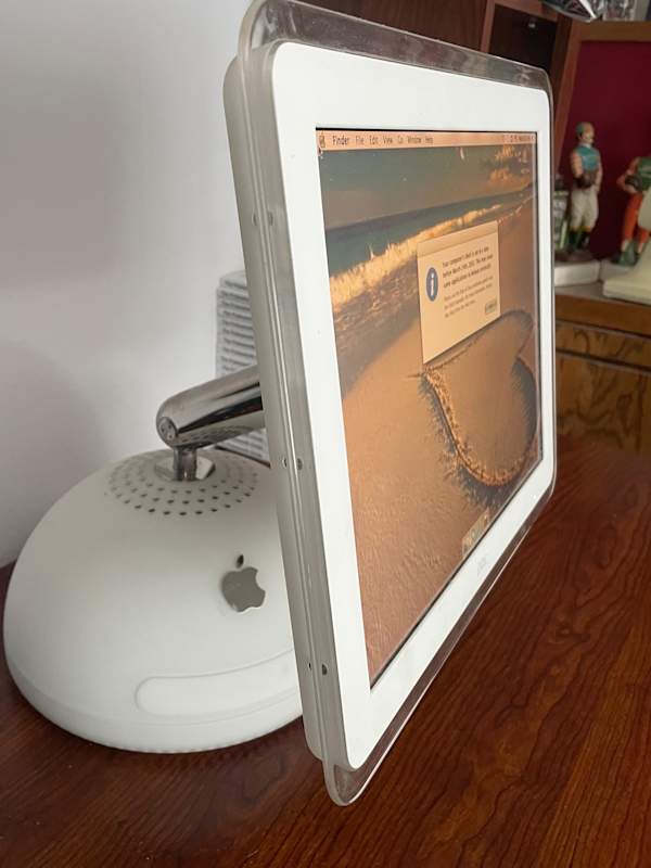 Pictured below is my iMac G4. It took me a while to power it up today. I had to “Google” for help to find the power switch. If you can read the error message, you will note that I have some clock issues to resolve due to its inactive state. You can also see the beautiful but expensive chrome neck. I must admit that I never bought this computer. I am the third owner, receiving it for free when my son upgraded. It was his sister-in-law’s before then. I used it a bit for music but saved it primarily because of its good looks.