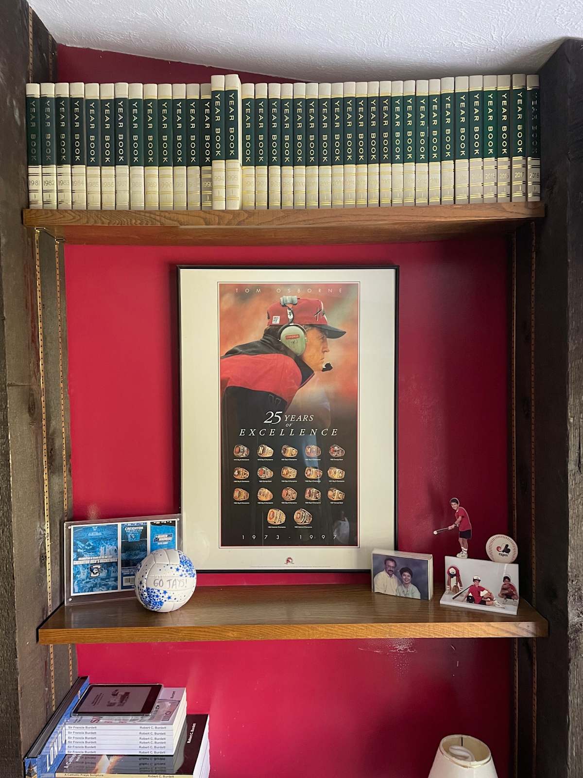 To capture all the yearbooks on my study’s shelf, I had to widen this blogs photograph to include some of the shelf space below and a framed poster of Tom Osborne, one of the two legendary Nebraska football coaches. The poster entitled “25 Years of Excellence” depicts the eighteen championship rings that Osborne’s teams won: twelve Big Eight championships, three Orange Bowl victories, and two national championships (1994 and 1995). In the photograph, you may have noticed the 1994 and 1995 yearbooks were pulled a bit forward in deference to those national championships.