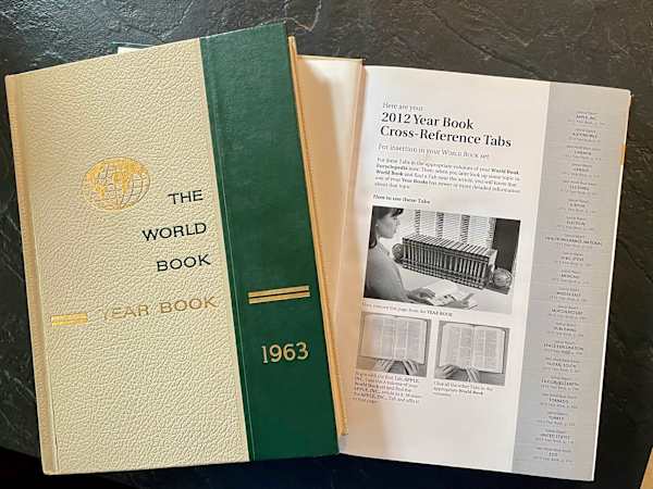 The first World Book Year Book (as a book) was published in 1962. It was an immediate success; more than two million copies were sold. My parents apparently missed the 1962 edition, but to keep their set of encyclopedias abreast of the times, they purchased The 1963 World Book Year Book. They continued to buy the subsequent editions until I later took possession of the encyclopedia set and the yearbooks they had accumulated.