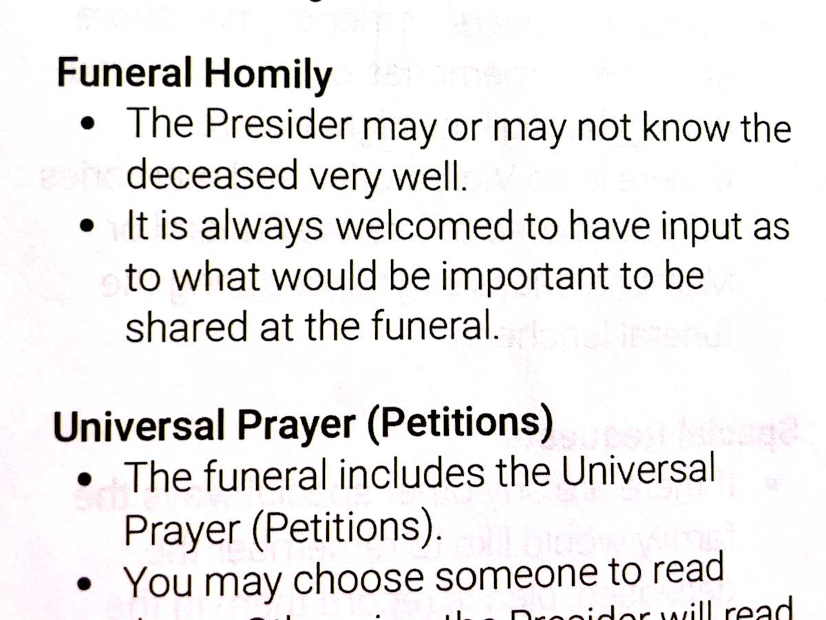 In the funeral guide, I noted the following: “The Presider may or may not know the deceased very well. It is always welcomed to have input as to what would be important to be shared at the funeral.” I also noted that there was an inch or so of space on the “Funeral Worksheet” for “Homily Ideas,” with an instruction to “attach another sheet if needed.”