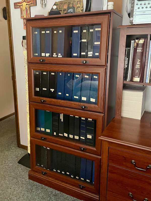 All these “physical” albums obviously take considerable space to store. Books #1 through #59 are all the same height but of different widths (2”, 2-1/2”, or 3”), reflecting what was available at the time I was shopping. Initially, I could find such albums in just about every drug or discount store in town, then just Walmart, and, as of late, just on Walmart’s online store. This change reflects the fact that most people are now saving their photos electronically (e.g., on their smartphones or on the “cloud”). Electronic storage obviously requires much less physical space. My collective photo albums currently require over 15 linear feet of storage – in two large barrister-style bookcases.