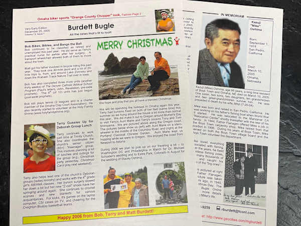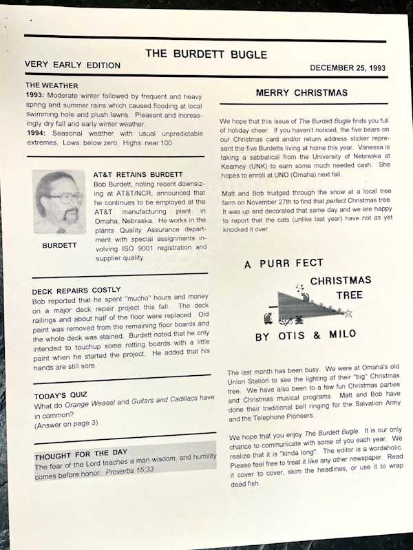 Then, in 1993, I had the idea of converting from the traditional “letter” format to a more polished looking “newspaper” format (with a masthead and sections on “The Weather,” “People in the News,” “Travel News,” “Sports,” “Engagements,” “Classified Ads,” and “Obituaries”). I stole the name of the “Bits ‘N’ Pieces” section from the local newspaper – the Omaha World-Herald. .” I tried to write with a third-person tone, like a real newspaper reporter (e.g., Bob and Terry blah blah blah).