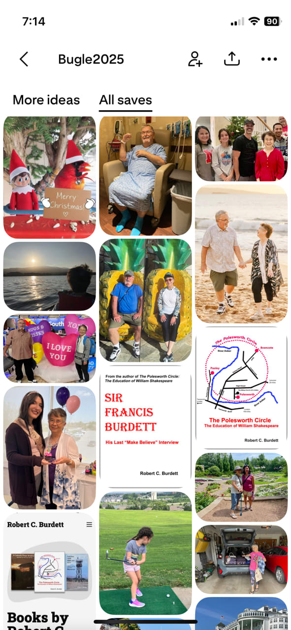 Below is a screenshot of what was displayed on my iPhone when I typed in pinterest.com/otisthecat/bugle2025 and selected (up on top) “All saves” versus “More ideas.”