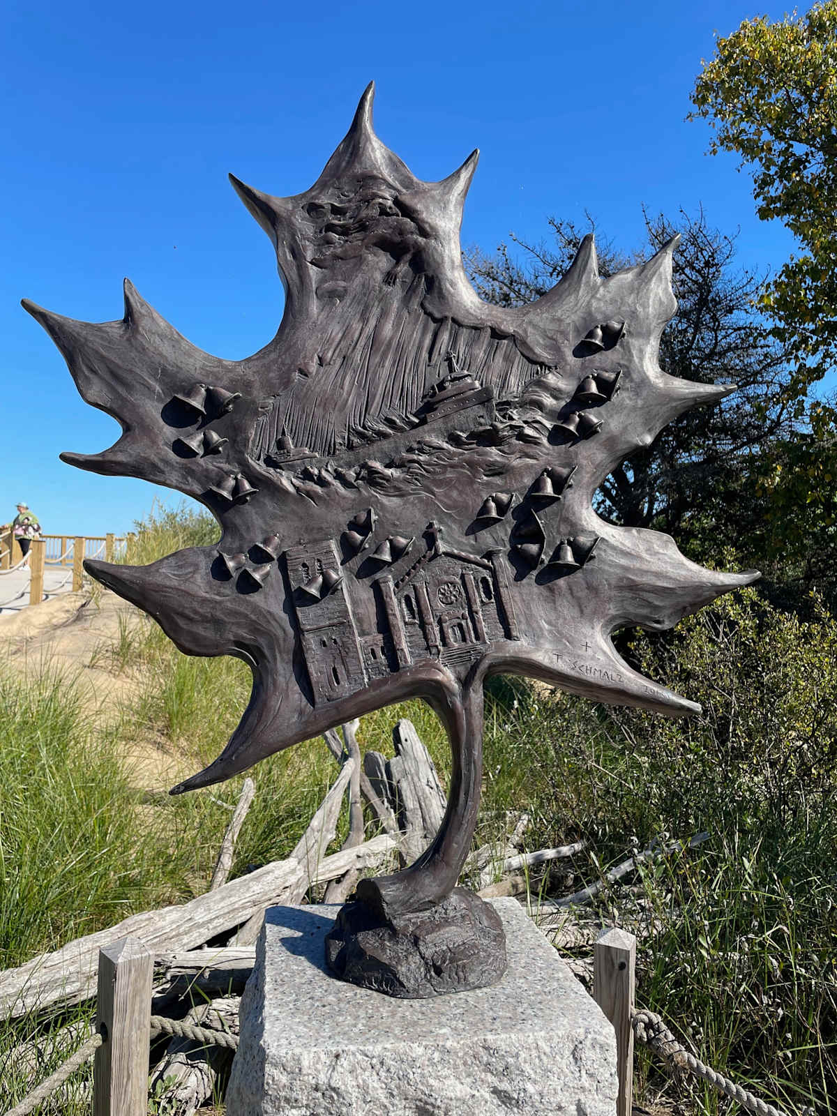 At the beginning of this article, you will find a photograph of a monument that is located at the starting point of a boardwalk that leads from the Great Lakes Shipwreck Museum’s buildings to the shoreline at Whitefish Point. The monument can be easily overlooked by those in a hurry to reach the waters of the bay. It appears at first to be a maple leaf with the characteristic sharp edges and stem of such leaves. When I viewed it more closely, I found it to be one of the best monuments that I had ever seen. It was not a leaf; it was a memorial to the Edmund Fitzgerald. Take a little time and zoom in on the details.