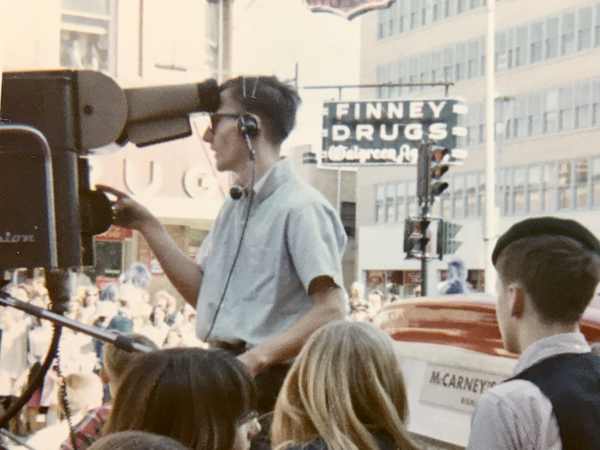 I became more interested in television in 1966, when during my senior year in high school, I began working as a cameraman at KFYR-TV, which was then part of the Meyer Broadcasting Company. I am pictured below manning “the” stations only functional camera during a parade in downtown Bismarck. At that time, I was zooming in on my sister, a baton twirler in the parade. Grandma said it looked like Marianne was coming through the TV screen; one of the perks of my job. The “cameraman” also setup the studio (e.g., props, lights, and microphones) for all the live programs and commercials.
