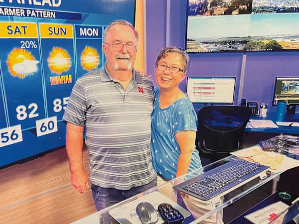 I have returned to Bismarck over the years and visited KFYR twice. The station has remained at the corner of Fourth and Broadway, downtown, over the years – on the second floor of the building that the Hoskins-Meyer floral shop first occupied in 1898. As you would expect, the control room and studio have changed radically over the years, as technology has changed. Most commercials today are digital and computerized; projectionists are few and far between. When my wife and I last visited the studio in 2021 we posed (below) on the weather set. It has changed significantly since the days when “chalk on chalkboard” was the technology that Karl Johnson used to note the highs and lows of the day. There were no “green screens” in those days.