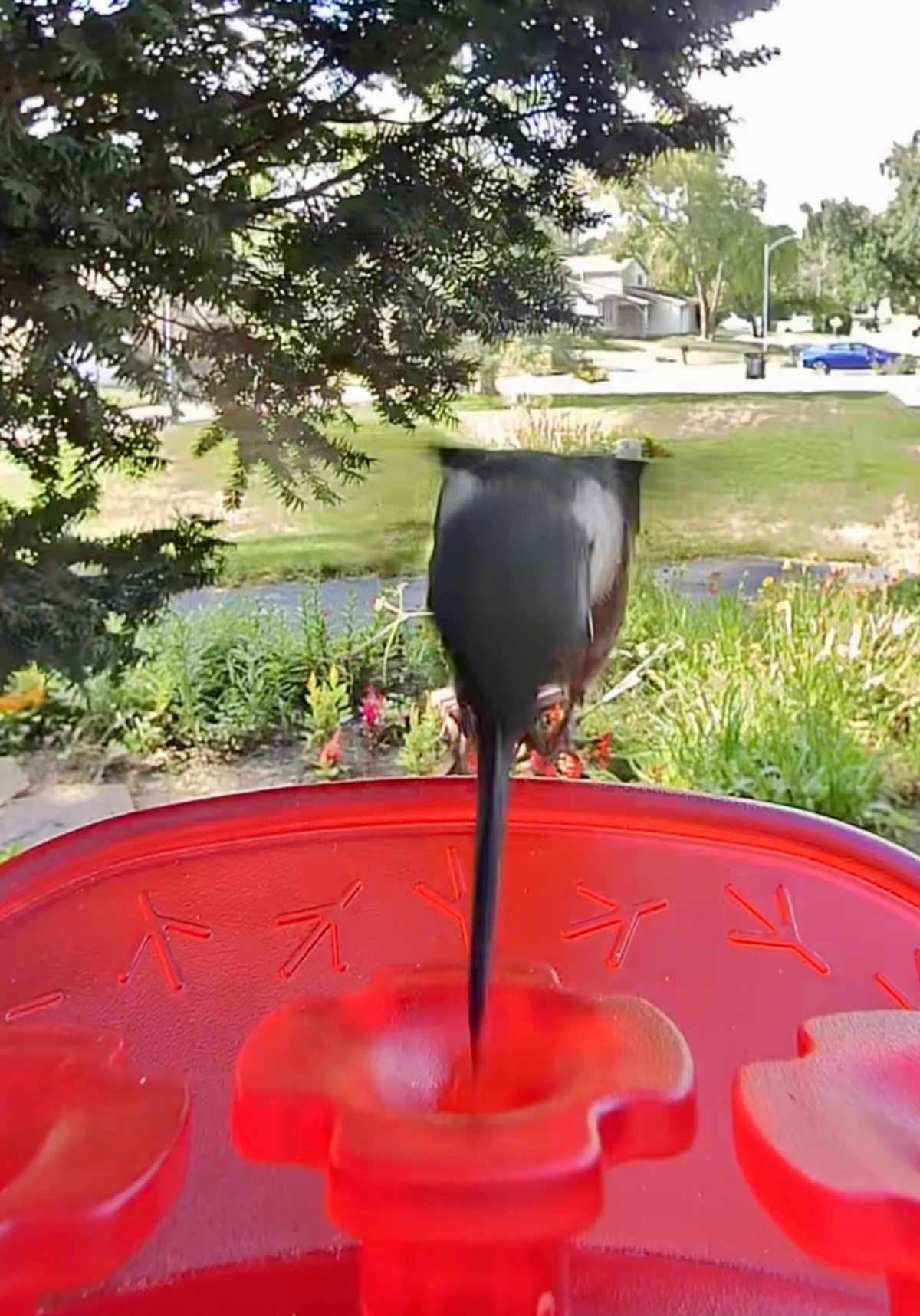 And then, on August 13th, Ruby appeared on my iPhone. Ruby is a male; the female version of the ruby-throated hummingbird does not have the cool iridescent red throat that the males do. Ruby hovered around for a few seconds; his wings humming away. His wings were flapping so fast that they all but disappeared from the videos and photographs taken. And good news, Ruby has returned many times since.